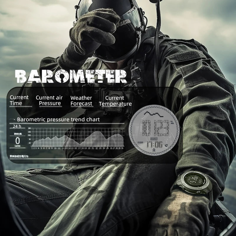 This sophisticated men's digital smartwatch features essential outdoor tools including an altimeter, barometer, and compass.